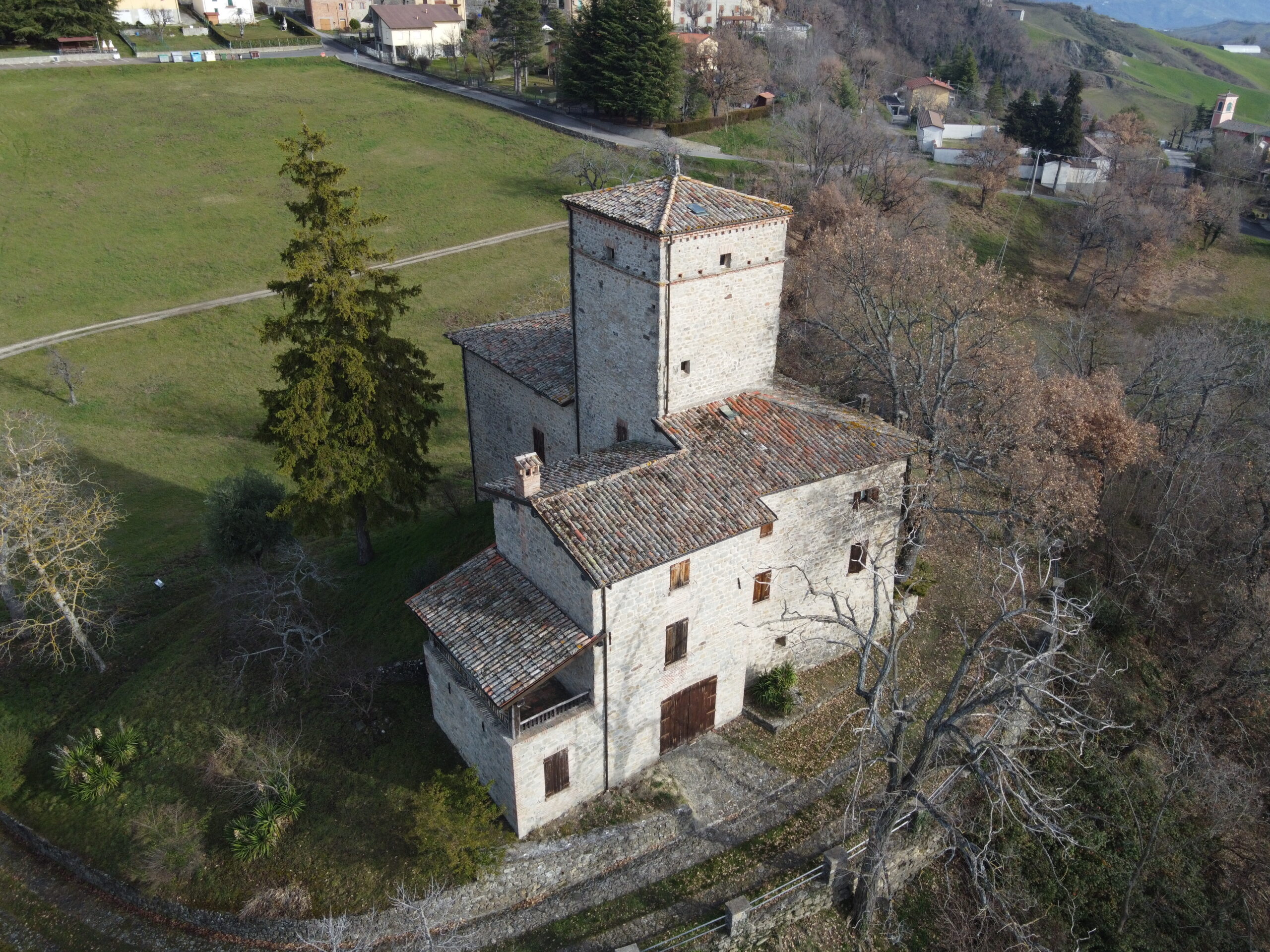 L’edificio appare presente nell’estimo del 1315, ma non si fa menzione della torre, ma solo di una casa col tetto di paglia.
