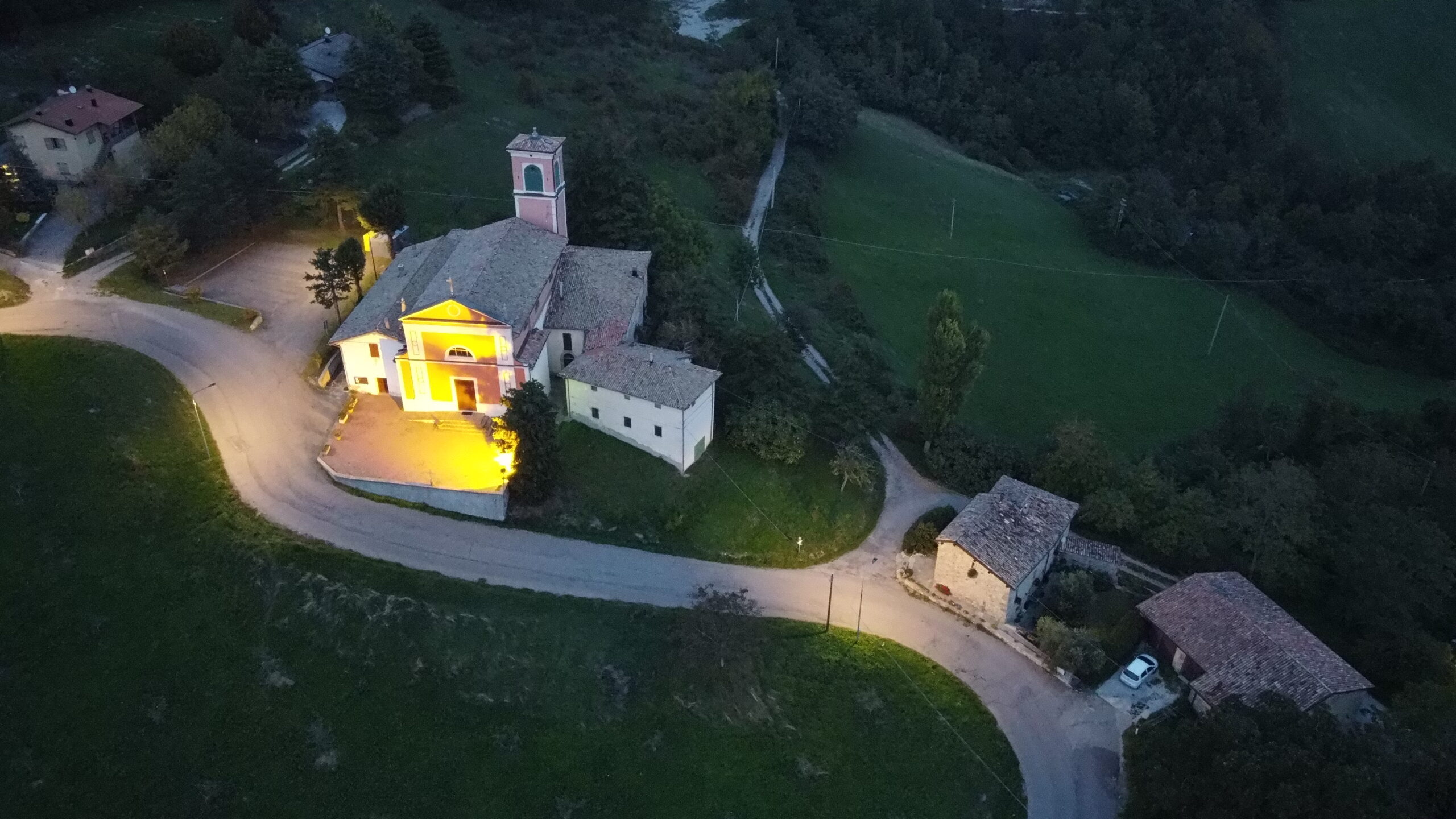La chiesa di San Martino sorge lungo il tracciato dell’antica via detta “Piccola Cassia”, presso il crinale spartiacque fra la valle del Reno e quella del Panaro, all’esterno del centro abitato attuale. Presenta un prospetto a salienti e fianchi difficilmente indagabili per l’aggregazione di più volumi sui tre lati dell’aula. L’interno a navata unica comprende otto cappelle laterali; l’aula è voltata a botte con unghie e lunette finestrate. Il presbiterio ha pianta quadrangolare ed è voltato a botte.contestoLa chiesa parrocchiale di San Martino sorge lungo l’antico tracciato denominato “Piccola Cassia” che dall’abbazia di Nonantola risaliva attraversando il modenese per poi deviare dalla via Romea Nonantolana e percorrere un tratto di crinale fra le vallate del Reno e del Panaro, fra Tolé e Castel d’Aiano. La chiesa sorge discosta dall’attuale nucleo abitativo principale, lungo una via che dal centro abitato costeggia il cimitero per scendere verso la parrocchiale. L’utilizzo, nel Novecento, di una parte delle abitazioni addossate all’aula come sede scolastica suggerisce tuttavia una centralità oggi perduta o non più evidente. L’aula è orientata.impianto planivolumetricoL’edificio di culto è parte di una aggregazione orizzontale di volumi che comprende la casa canonica e un secondo volume più basso a nord e, in parte, a ridosso dell’abside, il volume del campanile innestato ad est e un ulteriore volume più basso, un tempo destinato ad abitazione del sagrestano e del campanaro, addossato al lato sud.esternoL’aula è preceduta da un terrazzo con funzione di sagrato, delimitato da un muretto in affaccio sulla strada sottostante in forte pendenza. Il prospetto della chiesa, percorso orizzontalmente da due cornici aggettanti, presenta la parte inferiore scandita da due larghe lesene (una per lato) con una decorazione geometrica stilizzata in colore contrastante, poggianti su un alto basamento; al centro il portale, cui si accede da una breve scalinata, è inserito in una semplice incorniciatura modanata. La parte superiore, più corta della sottostante, è delimitata dalla prosecuzione delle due larghe lesene e, in asse con il portale, presenta una finestra a lunetta. La facciata è coronata dal timpano triangolare sormontato al vertice da una croce metallica, ed ornato lateralmente con due pinnacoli. La porzione superiore è raccordata a quella sottostante da due volute laterali (dal D.D.R. 2009/05/22). Il fianco sinistro evidenzia per un breve tratto la sporgenza del volume delle cappelle laterali, inglobato per massima parte dal volume della casa canonica addossata. Il presbiterio, parimenti celato in massima parte, ha pianta quadrangolare ed emerge per un breve tratto evidenziando una finitura in sasso a vista. Il fianco destro è caratterizzato dall’aggetto del volume che comprende le cappelle laterali; all’altezza del cleristorio si aprono le finestre a lunetta.piantaAd aula, con cappelle laterali e presbiterio quadrangolare.interniSi accede all’aula mediante una bussola affiancata da due nicchie entro le quali sono parzialmente incassati due confessionali lignei. Sopra l’ingresso, in asse, si aprono una nicchia parallelepipeda per statua e una finestra a lunetta. L’aula è pavimentata a mattonelle rettangolari posate a spina di pesce; al centro sono di colore più chiaro e disegnano una passerella tra l’ingresso e il presbiterio. Il volume dell’aula è ritmato in sei campate di passo irregolare (A-B-B-C-B-B) scandite da lesene con specchiatura centrale più scura sulle quali si imposta una trabeazione modanata con giro di dentelli; sulla trabeazione si imposta la volta a botte costolonata nella quale si inscrivono le finestre a lunetta in corrispondenza delle campate di passo maggiore. Nella prima campata da entrambi i lati si apre una cappella voltata a crociera. Nella seconda, quinta e sesta campata cornici a tutto sesto introducono ad altrettante cappelle laterali rialzate di un gradino e voltate a botte. Nella terza campata un’identica cornice inquadra una nicchia per statua. Nella quarta campata a destra si apre un ingresso laterale sormontato da un’altra nicchia per statua. Il presbiterio è rialzato di due gradini; i lavori intrapresi per l’adeguamento liturgico hanno portato all’allungamento dell’area presbiteriale fino a comprendere l’ultima cappella di entrambi i lati. La parte antica del presbiterio è introdotta da un arco ai lati del quale si aprono due porte con cornici in stucco. Il presbiterio antico ha pianta quadrangolare ed è voltato a botte; nella parete di fondo, accanto all’ancona, si aprono due finestrelle oggi apparentemente cieche.impianto strutturaleStruttura portante in pietra, orizzontamenti non indagabili, manto in coppi.apparati liturgiciL’assemblea è ordinata in due file di panche disposte a battaglione conformemente al volume dell’aula. Il presbiterio comprende un altare preconciliare in legno marmorizzato completo di dossale e custodia eucaristica al centro dei gradini, sormontata da ciborio su colonnine. A sinistra dell’altare la croce astile, a destra il cero pasquale. Al centro dell’area presbiteriale è collocato l’altare post conciliare. La sede è costituita da tre sedie poste in fondo, a destra; un ambone a leggio è collocato a sinistra. Il fonte battesimale è collocato nella prima cappella a sinistra. Due confessionali sono addossati alla controfacciata; un terzo confessionale monumentale è collocato nella seconda cappella a destra.